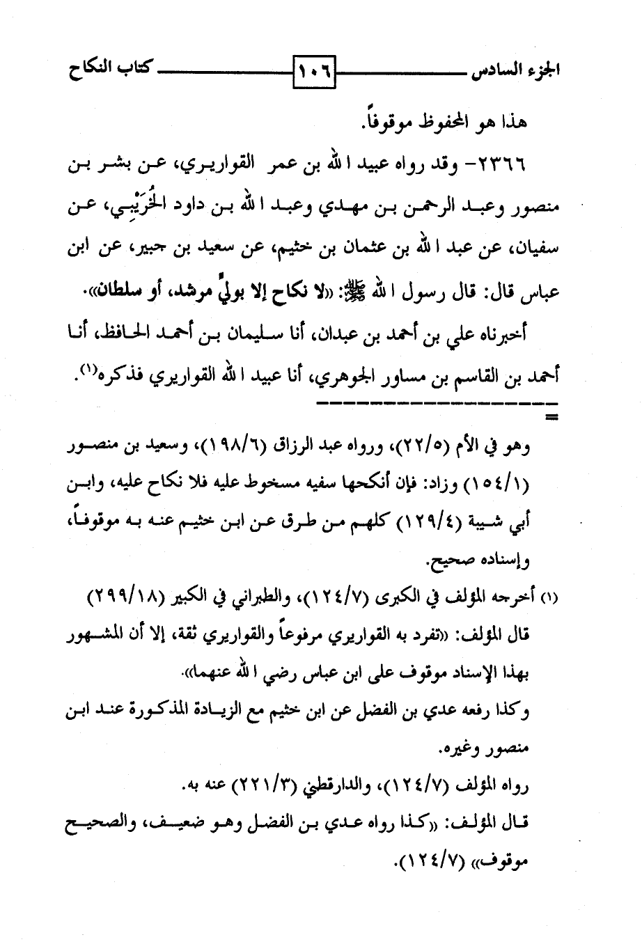 2366 - وقد رواه عبيد الله بن عمر القواريري ، عن بشر بن منصور وعبد الرحمن بن مهدي وعبد الله بن داود الخريبي ، عن سفيان ، عن عبد الله بن عثمان بن خثيم ، عن سعيد بن جبير ، عن ابن عباس قال : قال رسول الله صلى الله عليه وسلم : ' لا نكاح إلا بولي مرشد ، أو سلطان ' . أخبرناه علي بن أحمد بن عبدان ، أنا سليمان بن أحمد الحافظ ، أنا أحمد بن القاسم بن مساور الجوهري ، أنا عبيد الله القواريري فذكره ( 1 ) .