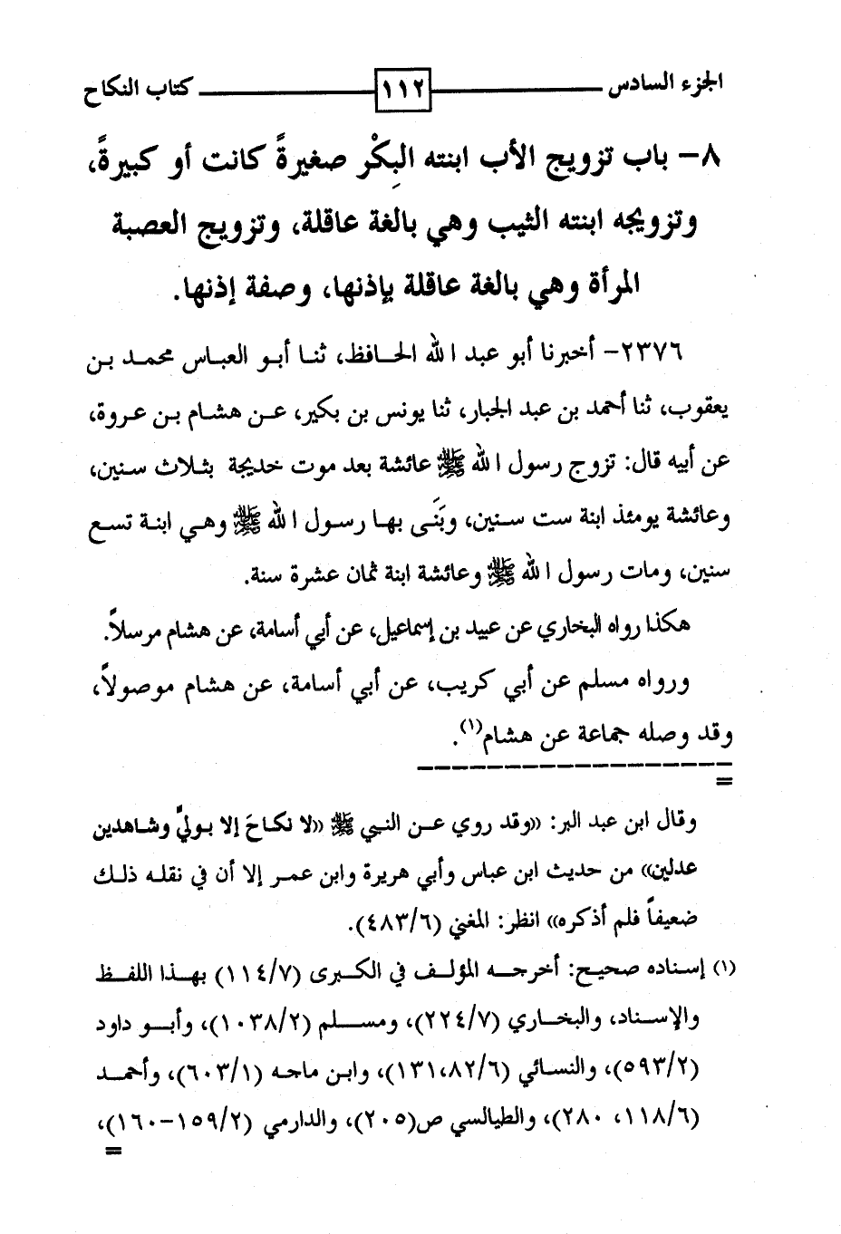 2376 - أخبرنا أبو عبد الله الحافظ ، ثنا أبو العباس محمد بن يعقوب ، ثنا أحمد بن عبد الجبار ، ثنا يونس بن بكير ، عن هشام بن عروة ، عن أبيه قال : تزوج رسول الله صلى الله عليه وسلم عائشة بعد موت خديجة بثلاث سنين ، وعائشة يومئذ ابنة ست سنين ، وبنى بها رسول الله صلى الله عليه وسلم وهي ابنة تسع سنين ، ومات رسول الله صلى الله عليه وسلم وعائشة ابنة ثمان عشرة سنة . هكذا رواه البخاري عن عبيد بن اسماعيل ، عن أبي أسامة ، عن هشام مرسلا . ورواه مسلم عن أبي كريب ، عن أبي اسامة ، عن هشام موصولا ، وقد وصله جماعة عن هشام ( 1 ) .