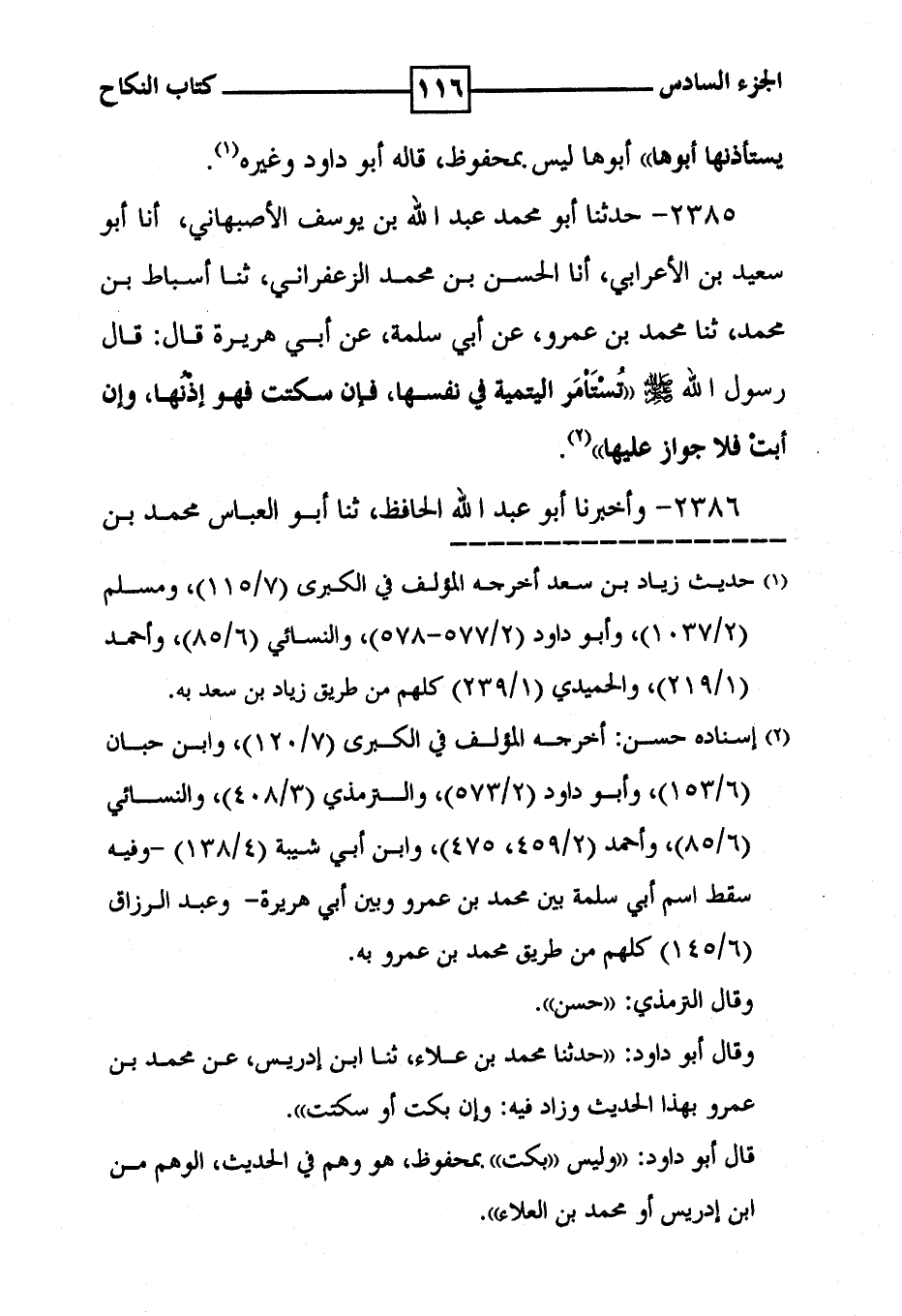 2385 - حدثنا أبو محمد عبد الله بن يوسف الاصبهاني ، أنا أبو سعيد بن الاعرابي ، أنا الحسن بن محمد الزعفراني ، ثنا أسباط بن محمد ، ثنا محمد بن عمرو ، عن أبي سلمة ، عن أبي هريرة قال : قال رسول الله صلى الله عليه وسلم ' تستأمر اليتيمية في نفسها ، فإن سكتت فهو إذنها ، وإن أبت فلا جواز عليها ' ( 2 ) .
