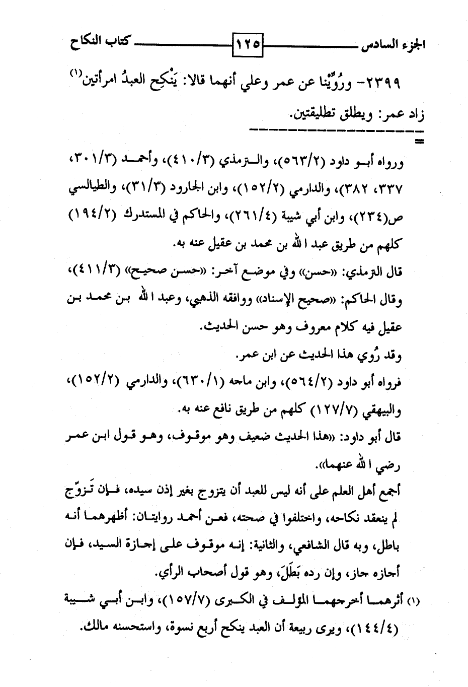 2399 - وروينا عن عمر وعلي أنهما قالا : ينكح العبد إمرأتين ( 1 ) زاد عمر : ويطلق تطليقتين .