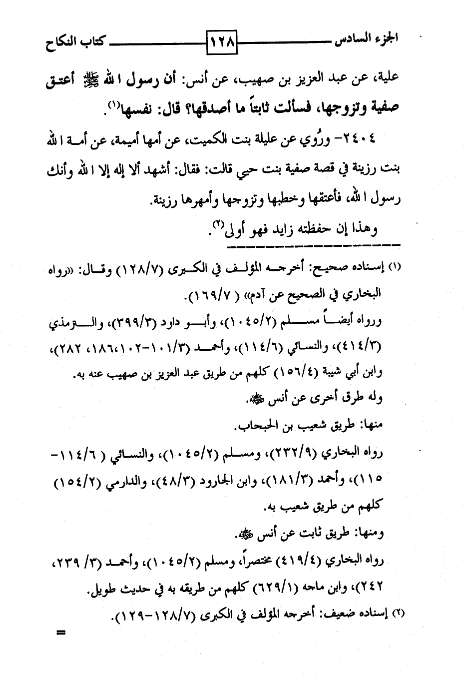 2404 - وروي عن عليلة بنت الكميت ، عن امها اميمة ، عن امة الله بنت رزينة في قصة صفية بنت حيي قالت : أشهد ألا إله إلا الله وانك رسول الله ، فأعتقها وخطبها وتزوجها وأمهرها رزينة . وهذا إن حفظته زايد فهو أولى ( 2 ) .