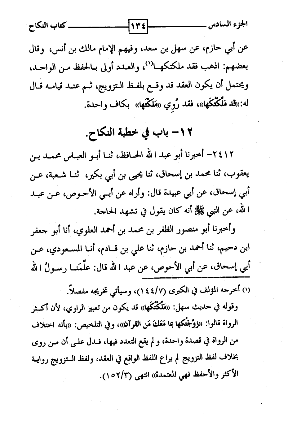 عن أبي حازم ، عن سهل بن سعد ، وفيهم الإمام مالك بن انس ، وقال بعضهم : اذهب فقد ملكتكها ( 1 ) ، والعدد أولى بالحفظ من الواحد ، ويحتمل أن يكون العقد قد وقع بلفظ التزويج ، ثم عند قيامه قال له : ' قد ملكتكها ' ، فقد روي ' ملكتها ' بكاف واحدة . 12 - باب في خطبة النكاح