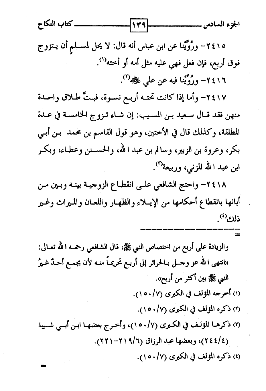 2415 - وروينا عن ابن عباس انه قال : لا يحل لمسلم أن يتزوج فوق اربع ، فإن فعل فهي عليه مثل أمه أو أخته ( 1 ) .