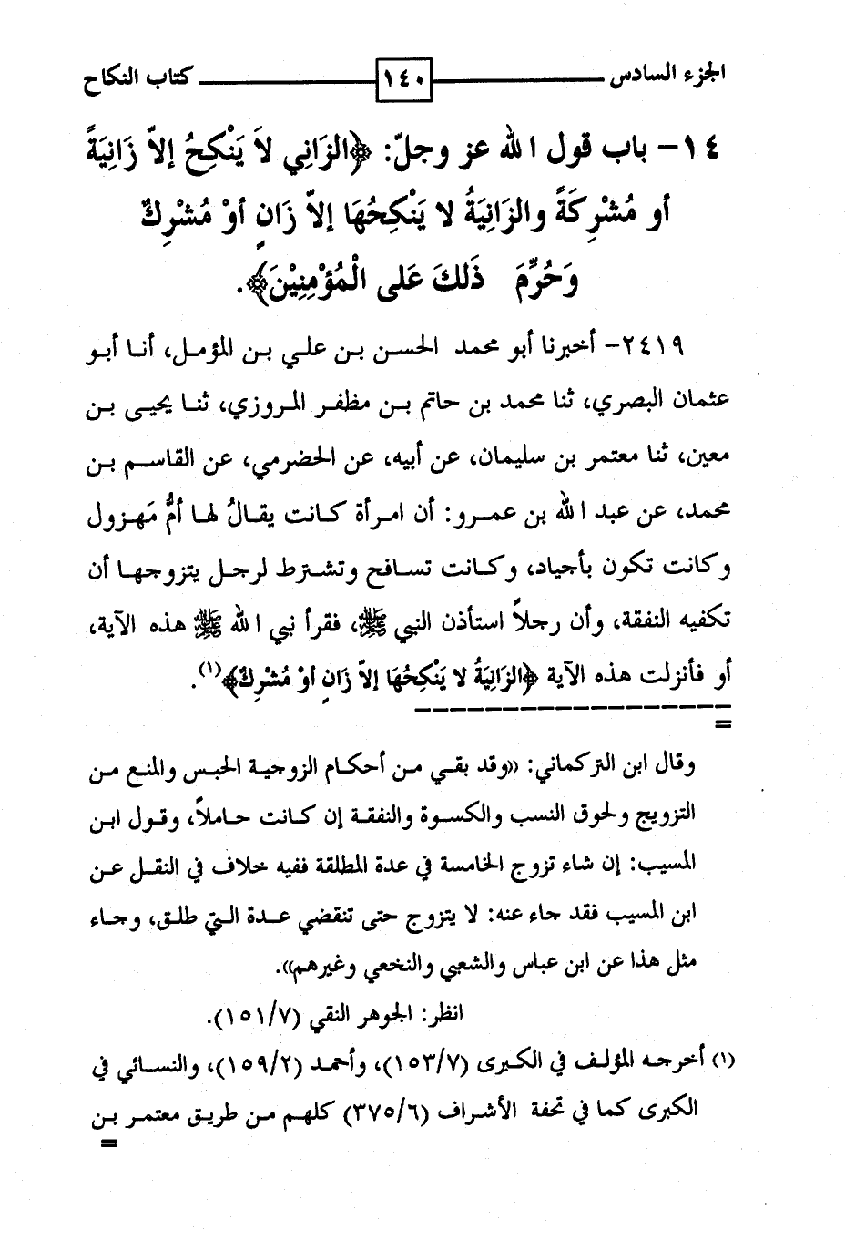 14 - باب قول الله عز وجل : ! ( الزاني لا ينكح إلا زانية أو مشركة والزانية لا ينكحها إلا زان أو مشرك وحرم ذلك على المؤمنين ) !