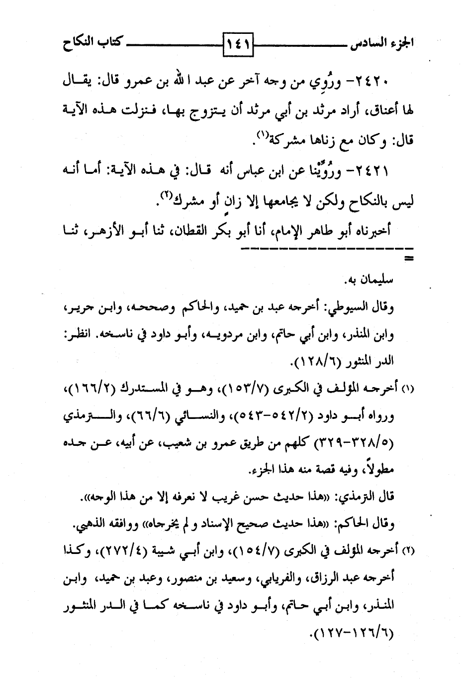 2421 - وروينا عن ابن عباس انه قال : في هذه الآية : أما انه ليس بالنكاح ولكن لا يجامعها إلا زان أو مشرك ( 2 ) . أخبرناه أبو طاهر الإمام ، أنا أبو بكر القطان ، ثنا أبو الازهر ، ثنا