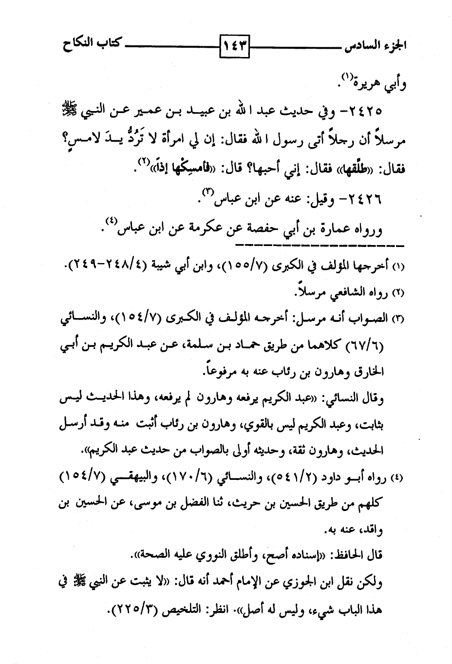 2425 - وفي حديث عبد الله بن عبيد بن عمير عن النبي صلى الله عليه وسلم مرسلا أن رجلا اتى رسول الله فقال : إن لي امرأة لا ترد يد لامس ؟ فقال : ' طلقها ' فقال : إني احبها ؟ قال : ' فأمسكها إذا ' ( 2 ) .