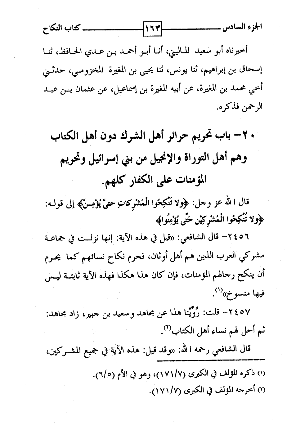 2456 - قال الشافعي : ' قيل في هذه الآية : إنها نزلت في جماعة مشركي العرب الذين هم أهل اوثان ، فحرم نكاح نسائهم كما يحرم أن ينكح رجالهم المؤمنات ، فإن كان هذا هكذا فهذه الآية ثابتة ليس فيها منسوخ ' ( 1 ) .
