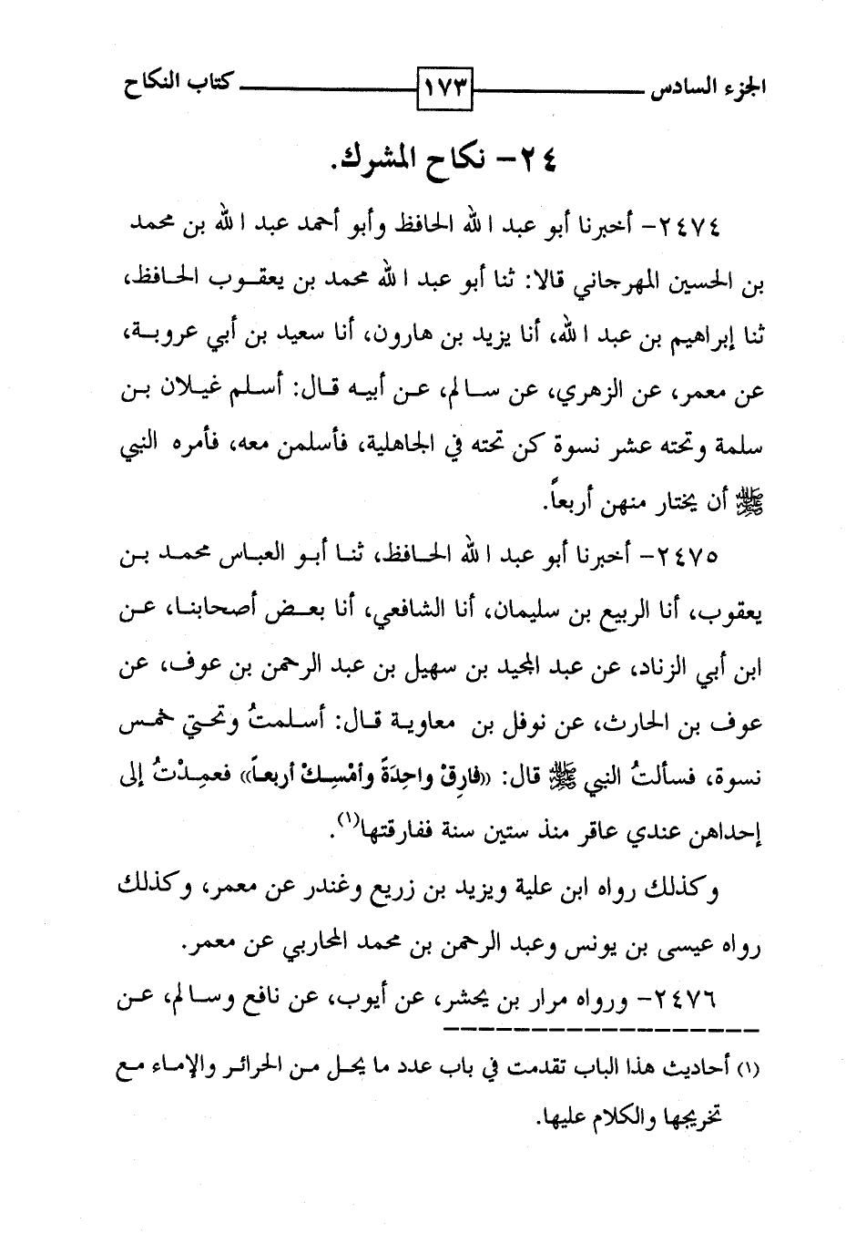2474 - أخبرنا أبو عبد الله الحافظ وأبو أحمد عبد الله بن محمد بن الحسين المهرجاني قالا : ثنا أبو عبد الله محمد بن يعقوب الحافظ ، ثنا إبراهيم بن عبد الله ، أنا يزيد بن هارون ، أنا سعيد بن أبي عروبة ، عن معمر ، عن الزهري ، عن سالم ، عن أبيه قال : اسلم غيلان بن سلمة وتحته عشر نسوة كن تحته في الجاهلية ، فأسلمن معه ، فأمره النبي صلى الله عليه وسلم أن يختار منهن اربعا .