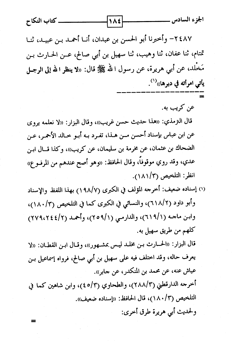 2487 - واخبرنا أبو الحسن بن عبدان ، أنا أحمد بن عبيد ، ثنا تمتام ، ثنا عفان ، ثنا وهيب ، ثنا سهيل بن أبي صالح ، عن الحارث بن مخلد ، عن أبي هريرة ، عن رسول الله صلى الله عليه وسلم قال : ' لا ينظر الله إلى الرجل يأتي امرأته في دبرها ' ( 1 ) .