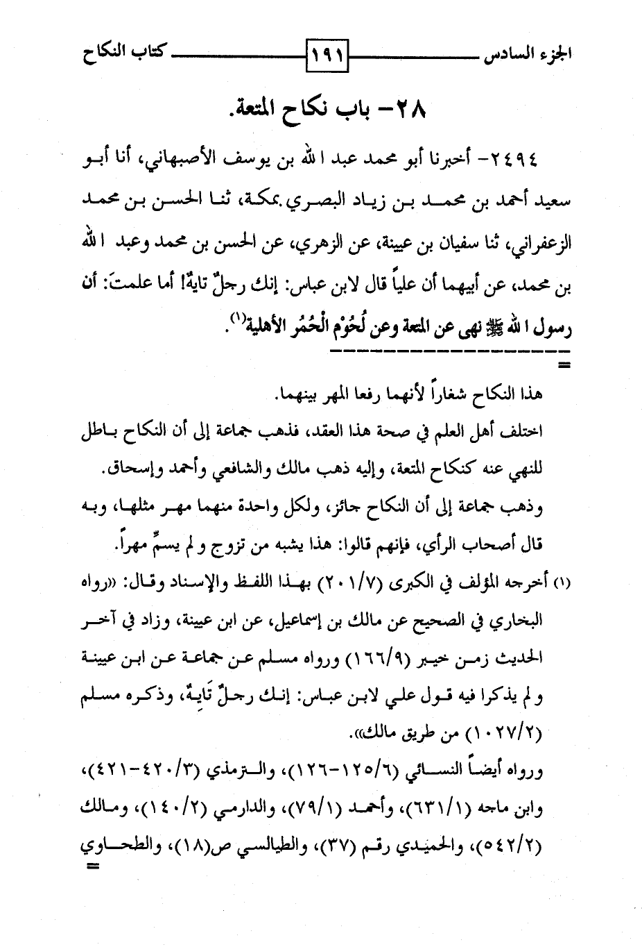 2494 - أخبرنا أبو محمد عبد الله بن يوسف الاصبهاني ، أنا أبو سعيد أحمد بن محمد بن زياد البصري بمكة ، ثنا الحسن بن محمد الزعفراني ، ثنا سفيان بن عيينة ، عن الزهري ، عن الحسن بن محمد وعبد الله بن محمد ، عن أبيهما أن عليا قال لابن عباس : إنك رجل تايه ! أما علمت : أن رسول الله صلى الله عليه وسلم نهى عن المتعة وعن لحوم الحمر الأهلية ( 1 ) .