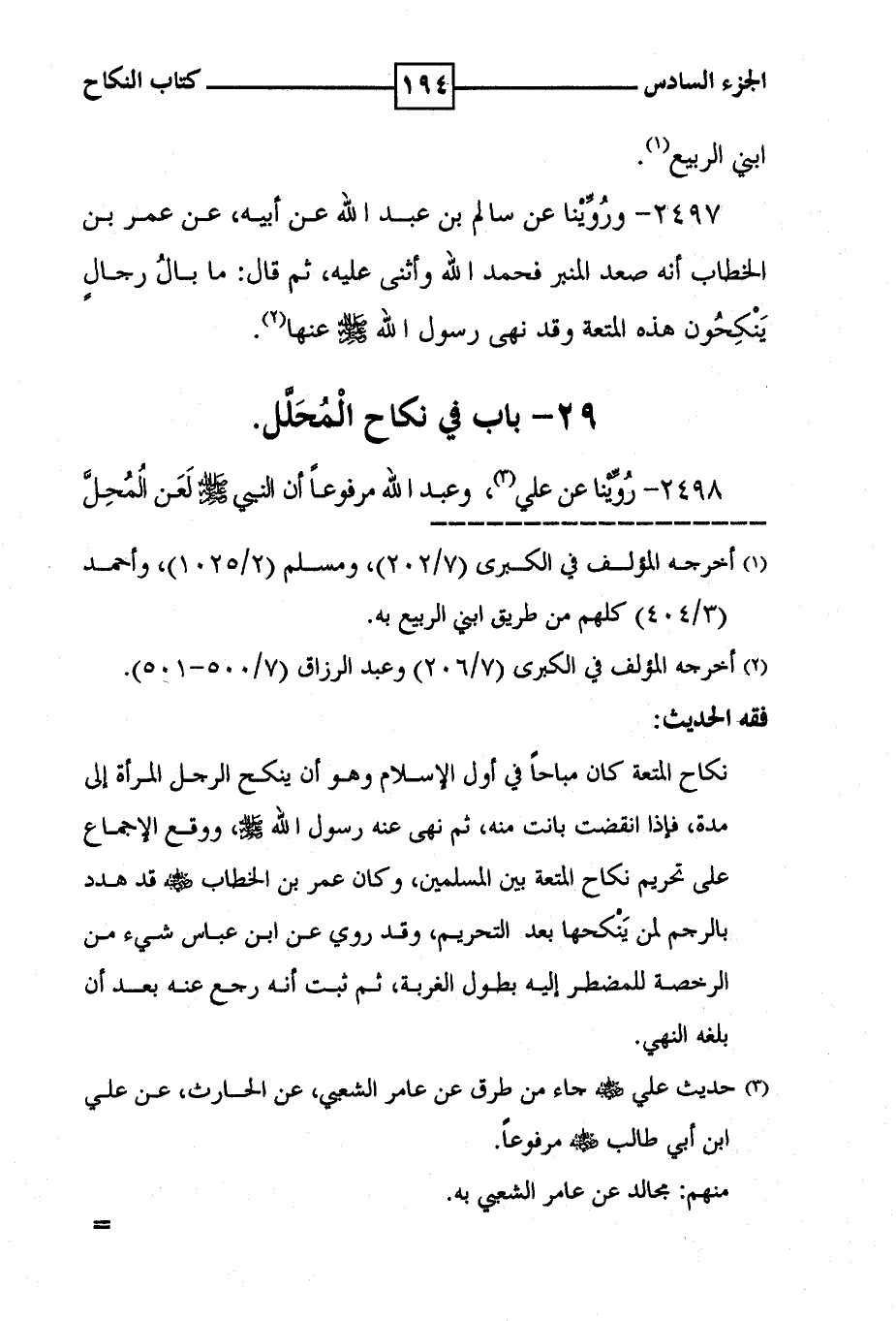 2497 - وروينا عن سالم بن عبد الله عن ابيه ، عن عمر بن الخطاب انه صعد المنبر فحمد الله واثنى عليه ، ثم قال : ما بال رجال ينكحون هذه المتعة وقد نهى رسول الله صلى الله عليه وسلم عنها ( 2 ) . 29 - باب في نكاح المحلل