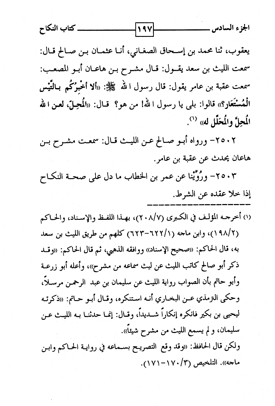 يعقوب ، ثنا محمد بن إسحاق الصغاني ، أنا عثمان بن صالح قال : سمعت الليث بن سعد يقول : قال مشرح بن هاعان أبو المصعب : سمعت عقبة بن عامر يقول : قال رسول الله صلى الله عليه وسلم : ' الا اخبركم بالتيس المستعار ؟ ' قالوا : بلى يا رسول الله ! من هو ؟ قال : ' المحل ، لعن الله المحل والمحلل له ' ( 1 ) .