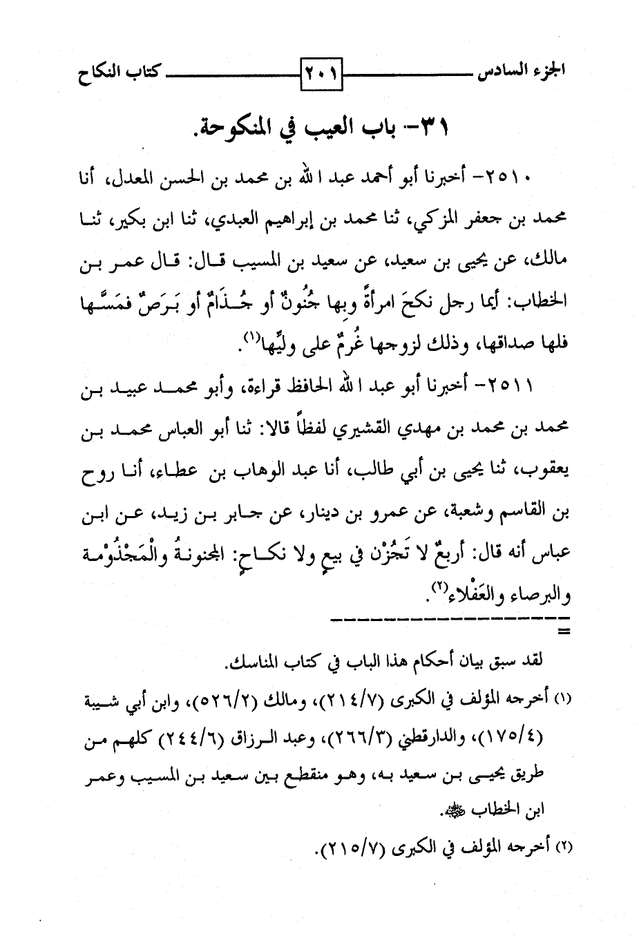 2510 - أخبرنا أبو أحمد عبد الله بن محمد بن الحسن المعدل ، أنا محمد بن جعفر المزكي ، ثنا محمد بن إبراهيم العبدي ، ثنا ابن بكير ، ثنا مالك ، عن يحيى بن سعيد ، عن سعيد بن المسيب قال : قال عمر بن الخطاب : أيما رجل نكح امرأة وبها جنون أو جذام أو برص فمسها فلها صداقها ، وذلك لزوجها غرم على وليها ( 1 ) .