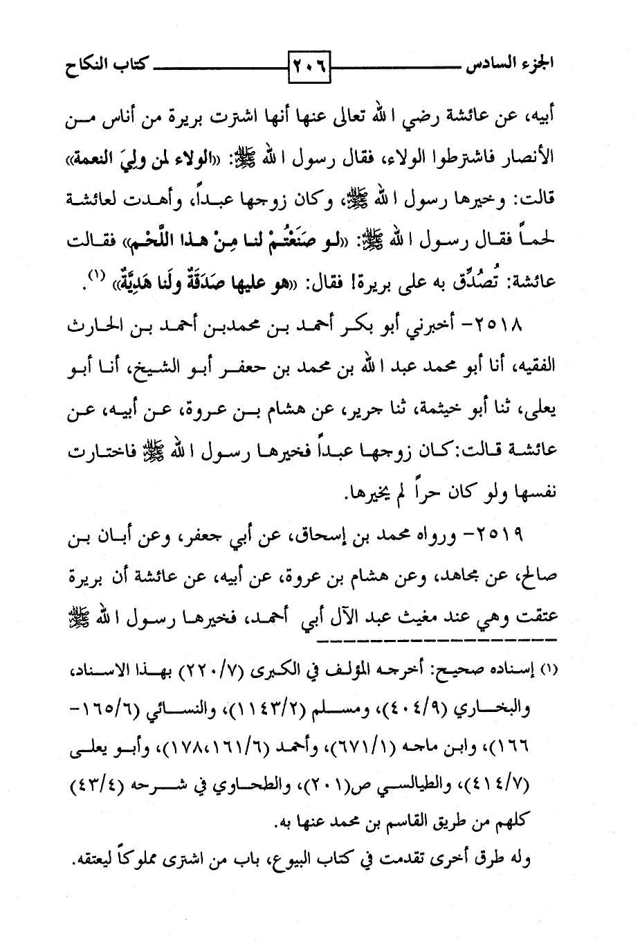 2518 - اخبرني أبو بكر أحمد بن محمد بن أحمد بن الحارث الفقيه ، أنا أبو محمد عبد الله بن محمد بن حعفر أبو الشيخ ، أنا أبو يعلى ، ثنا أبو خيثمة ، ثنا جرير ، عن هشام بن عروة ، عن ابيه ، عن عائشة قالت : كان زوجها عبدا فخيرها رسول الله صلى الله عليه وسلم فاختارت نفسها ولو كان حرا لم يخيرها .