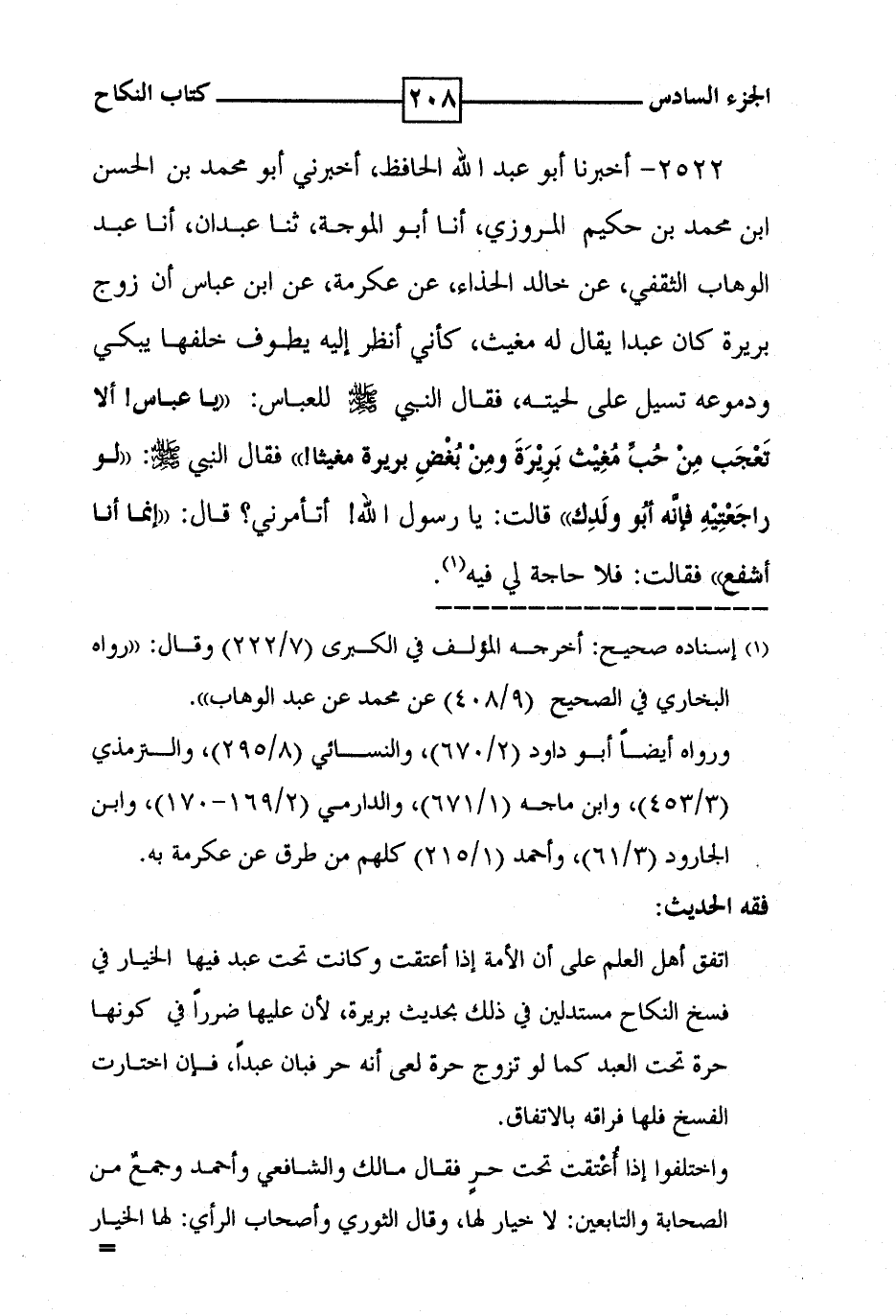 2522 - أخبرنا أبو عبد الله الحافظ ، اخبرني أبو محمد بن الحسن ابن محمد بن حكيم المروزي ، أنا أبو الموجة ، ثنا عبدان ، أنا عبد الوهاب الثقفي ، عن خالد الحذاء ، عن عكرمة ، عن ابن عباس أن زوج بريرة كان عبدا يقال له مغيث ، كأني انظر إليه يطوف خلفها يبكي ودموعه تسيل على لحيته ، فقال النبي صلى الله عليه وسلم للعباس : ' يا عباس ! ألا تعجب من حب مغيث بريرة ومن بغض بريرة مغيثا ! ' فقال النبي صلى الله عليه وسلم ' لو راجعتيه فإنه أبو ولدك ' قالت : يا رسول الله ! أتأمرني ؟ قال : ' إنما أنا اشفع ' فقالت : فلا حاجة لي فيه ( 1 ) .