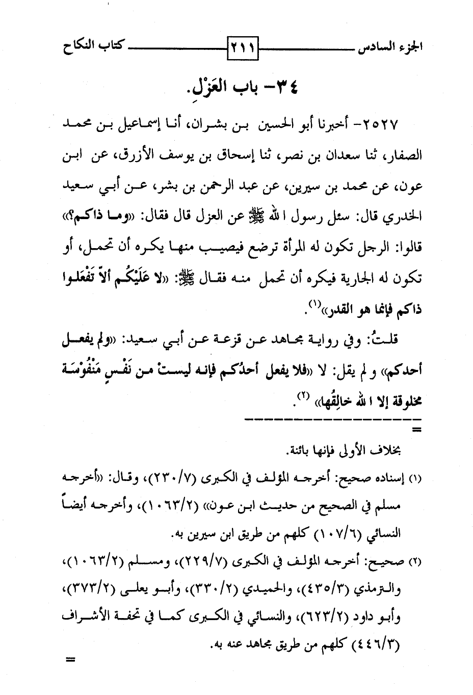 2527 - أخبرنا أبو الحسين بن بشران ، أنا إسماعيل بن محمد الصفار ، ثنا سعدان بن نصر ، ثنا إسحاق بن يوسف الازرق ، عن ابن عون ، عن محمد بن سيرين ، عن عبد الرحمن بن بشر ، عن أبي سعيد الخدري قال : سئل رسول الله صلى الله عليه وسلم عن العزل قال فقال : ' وما ذاكم ؟ ' قالوا : الرجل تكون له المرأة ترضع فيصيب منها يكره أن تحمل ، أو تكون له الجارية فيكره أن تحمل منه فقال صلى الله عليه وسلم : ' لا عليكم ألا تفعلوا ذاكم فإنما هو القدر ' ( 1 ) . قلت : وفي رواية مجاهد عن قزعة عن أبي سعيد : : ولم يفعل أحدكم ' ولم يقل : لا ' فلا يفعل أحدكم فإنه ليست من نفس منفوسة مخلوقة إلا الله خالقها ' ( 2 ) .