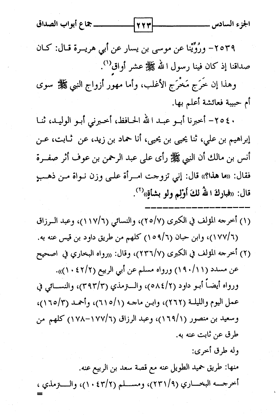2540 - أخبرنا أبو عبد الله الحافظ ، اخبرني أبو الوليد ، ثنا إبراهيم بن علي ، ثنا يحيى بن يحيى ، أنا حماد بن زيد ، عن ثابت ، عن أنس بن مالك أن النبي صلى الله عليه وسلم رأى على عبد الرحمن بن عوف اثر صفرة فقال : ' ما هذا ؟ ' قال : إني تزوجت امرأة على وزن نواة من ذهب قال : ' فبارك الله لك أولم ولو بشأة ' ( 2 ) .