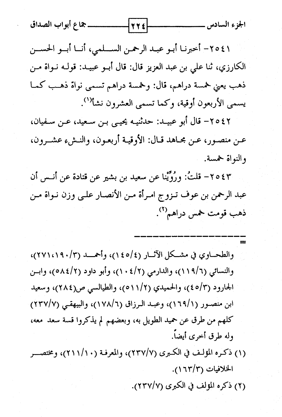 2541 - أخبرنا أبو عبد الرحمن السلمي ، أنا أبو الحسن الكارزي ، ثنا علي بن عبد العزيز قال : قال أبو عبيد : قوله نواة من ذهب يعني خمسة دراهم ، قال : وخمسة دراهم تسمى نواة ذهب كما يسمى الاربعون اوقية ، وكما تسمى العشرون نشأ ( 1 ) .