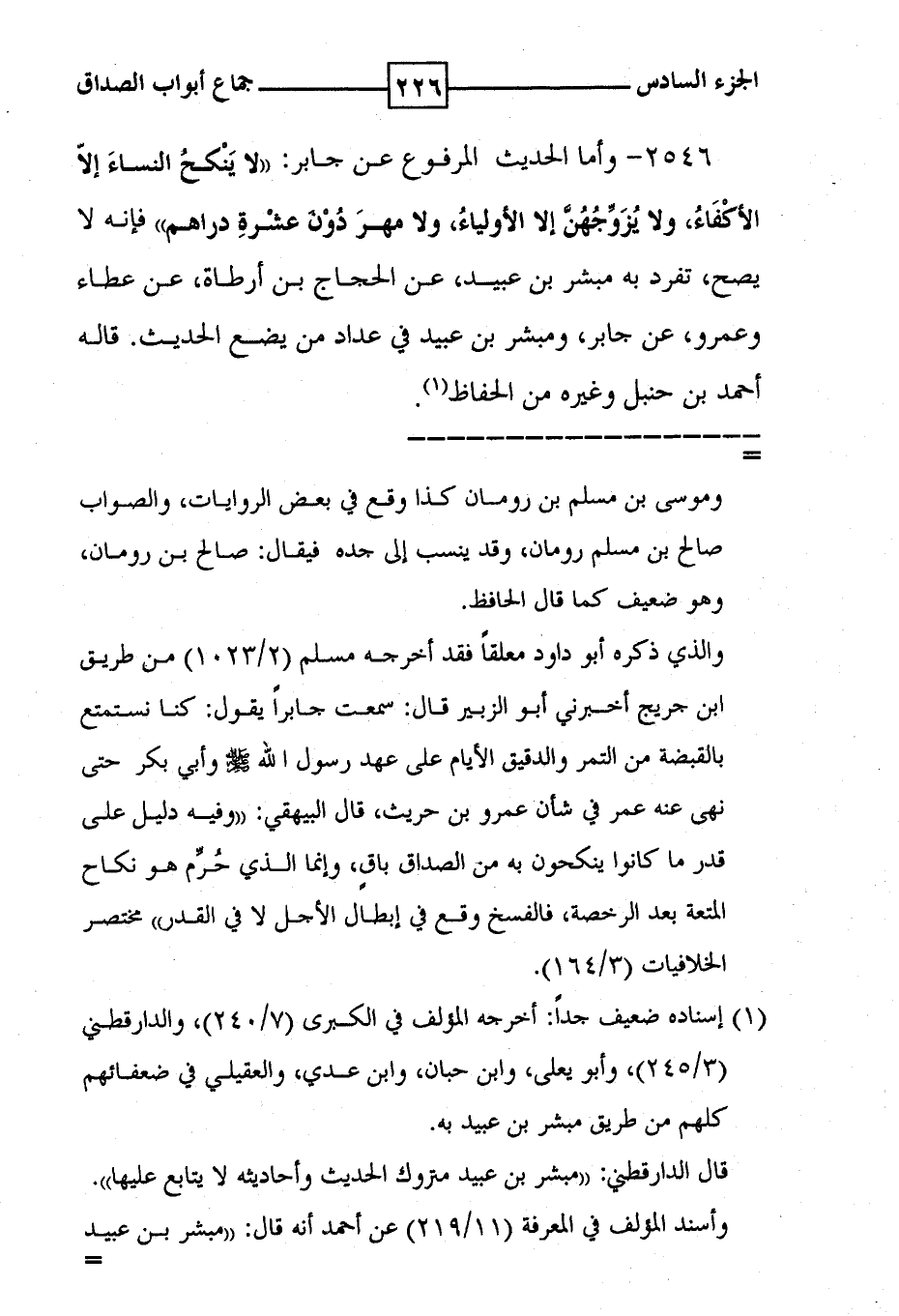 2546 - واما الحديث المرفوع عن جابر : ' لا ينكح النساء إلا الاكفاء ، ولا يزوجهن الأولياء ، ولا مهر دون عشرة دراهم ' فإنه لا يصح ، تفرد بن مبشر بن عبيد ، عن الحجاج بن أرطاة ، عن عطاء وعمرو ، عن جابر ، ومبشر بن عبيد في عداد من يضع الحديث . قاله أحمد بن حنبل وغيره من الحفاظ ( 1 ) .