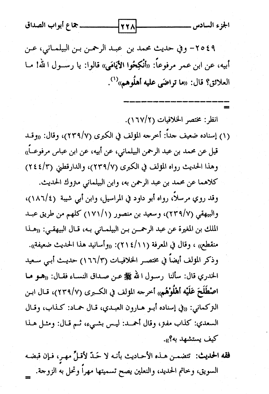 2549 - وفي حديث محمد بن عبد الرحمن بن البيلماني ، عن ابيه ، عن ابن عمر مرفوعا : ' انكحوا الأيامي ' قالوا : يا رسول الله ! ما العلائق ؟ قال : ' ما تراضى عليه أهلوهم ' ( 1 ) .