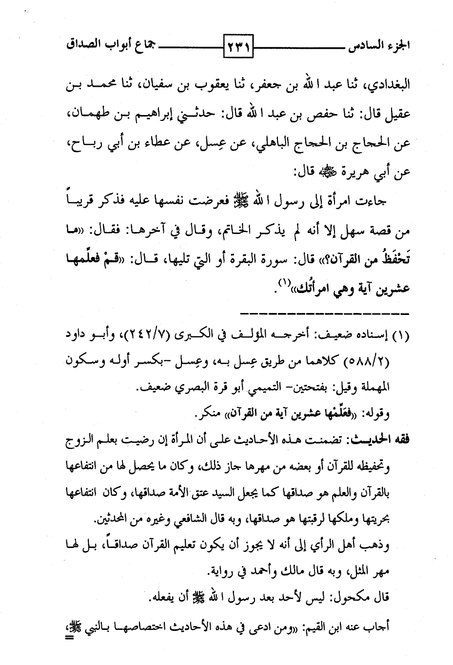 البغدادي ، ثنا عبد الله بن جعفر ، ثنا يعقوب بن سفيان ، ثنا محمد بن عقيل قال : ثنا حفص بن عبد الله قال : حدثني إبراهيم بن طهمان ، عن الحجاج بن الحجاج الباهلي ، عن عسل ، عن عطاء بن أبي رباح ، عن أبي هريرة صلى الله عليه وسلم قال : جاءت امرأة إلى رسول الله صلى الله عليه وسلم فعرضت نفسها عليه فذكر قريبا من قصة سهل إلا أنه لم يذكر الخاتم ، وقال في آخرها : فقال : ' ما تحفظ من القرآن ؟ ' قال : سورة البقرة أو التي تليها ، قال : قم فعلمها عشرين آية وهي امرأتك ' ( 1 ) . \