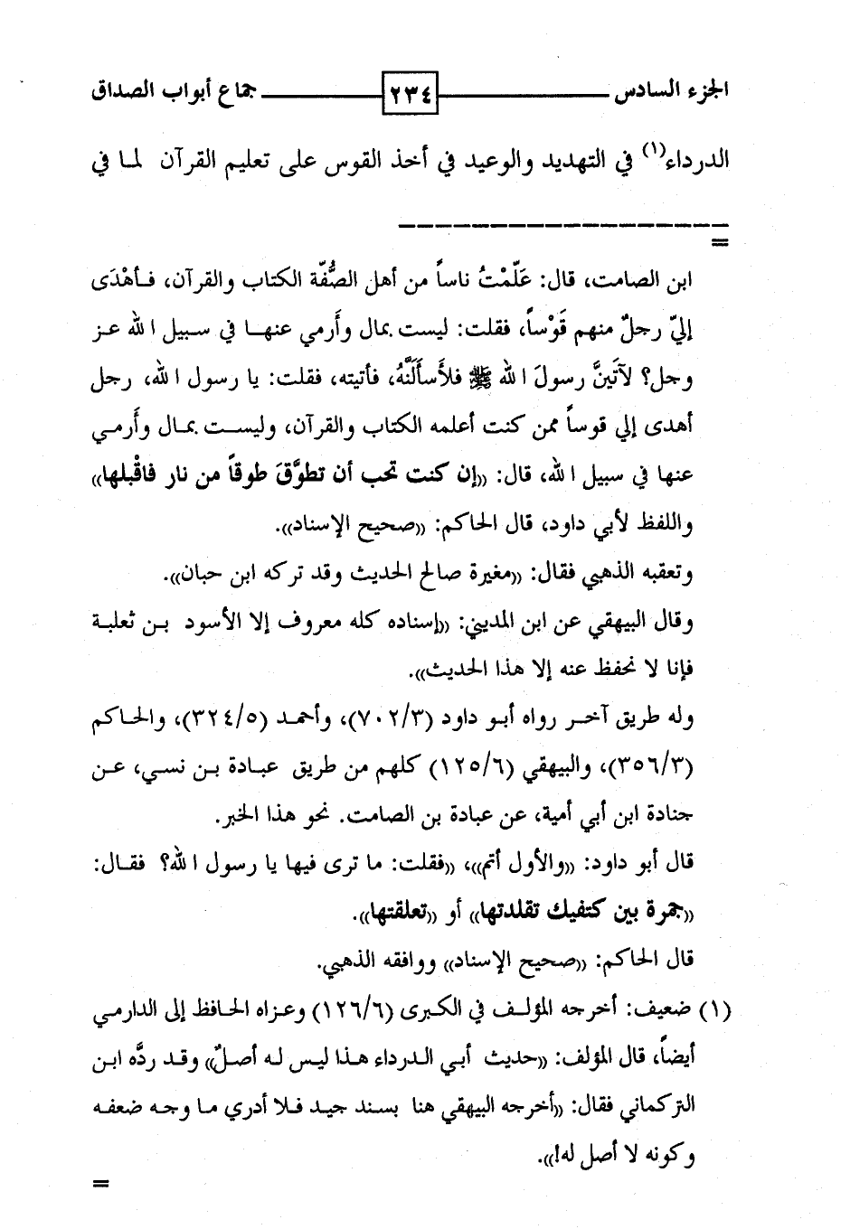 الدرداء في التهديد والوعيد في اخذ القوس على تعليم القرآن لما في
