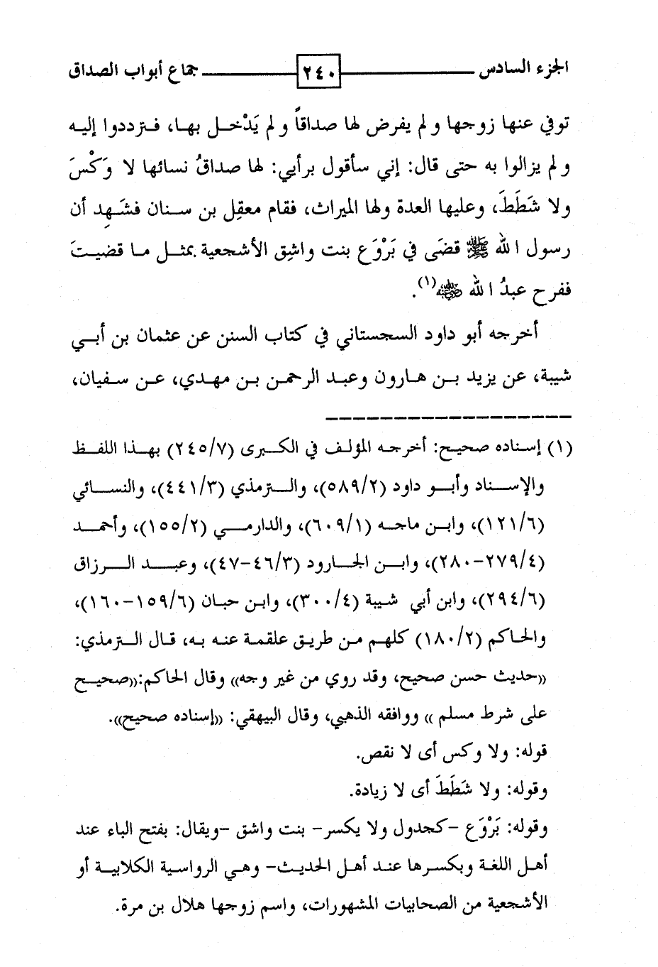 توفي عنها زوجها ولم يفرض لها صداقا ولم يدخل بها ، فترددوا إليه ولم يزالوا به حتى قال : إني سأقول برأيي : لها صداق نسائها لا وكس ولا شطط ، وعليها العدة ولها الميراث ، فقام معقل بن سنان فشهد أن رسول الله صلى الله عليه وسلم قضى في بروع بنت واشق الاشجعية بمثل ما قضيت ففرح عبد الله رضي الله عنه ( 1 ) . أخرجه أبو داود السجستاني في كتاب السنن عن عثمان بن أبي شيبة ، عن يزيد بن هارون وعبد الرحمن بن مهدي ، عن سفيان ،