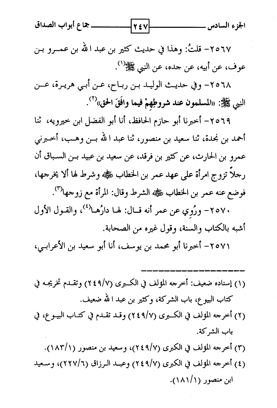 2568 - وفي حديث الوليد بن رباح ، عن أبي هريرة ، عن النبي صلى الله عليه وسلم : ' المسلمون عند شروطهم فيما وافق الحق ' ( 2 ) .