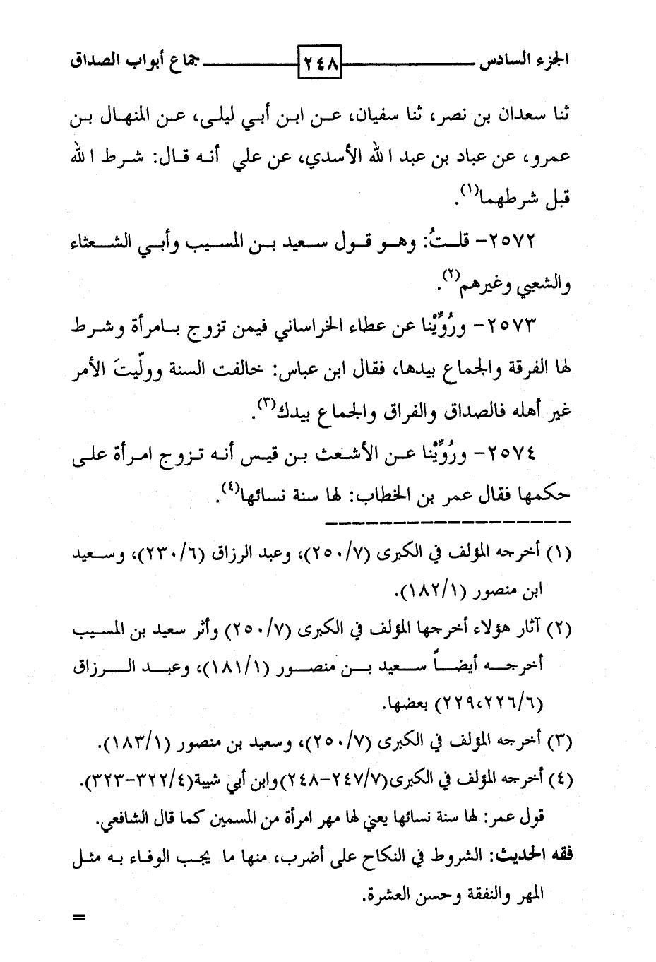 2574 - وروينا عن الأشعث بن قيس انه تزوج امرأة على حكمها فقال عمر بن الخطاب : لها سنة نسائها ( 4 ) .
