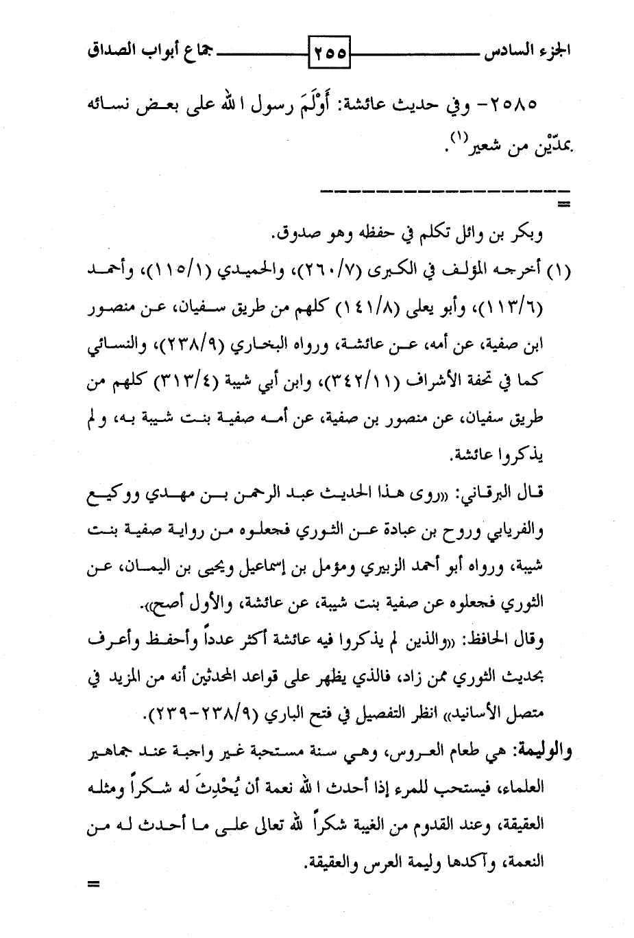 2585 - وفي حديث عائشة : أولم رسول الله صلى الله عليه وسلم على بعض نسائه بمدين من شعير ( 1 ) .