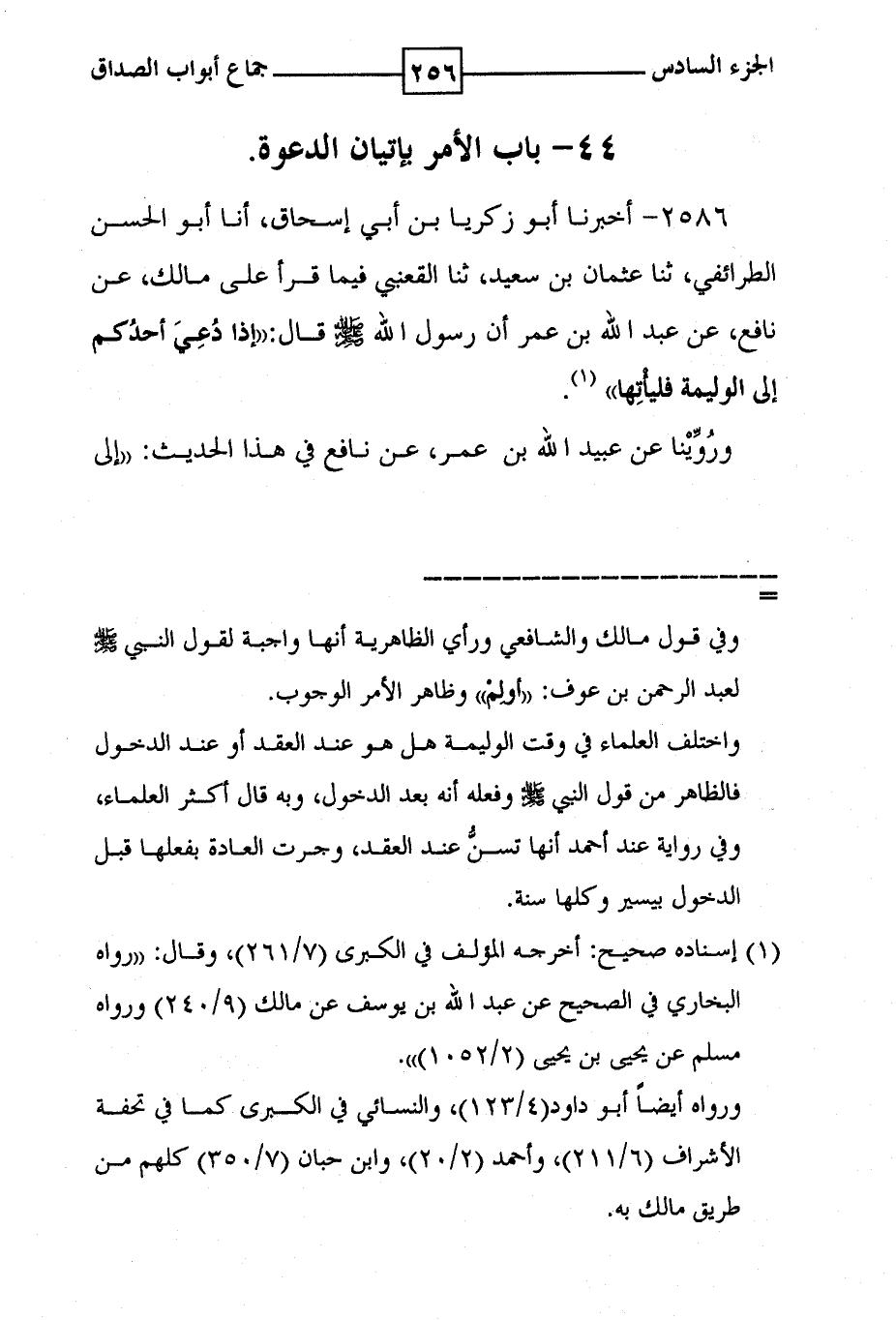 2586 - أخبرنا أبو زكريا بن أبي اسحاق ، أنا أبو الحسن الطرائفي ، ثنا عثمان بن سعيد ، ثنا القعنبي فيما قرأ على مالك ، عن نافع ، عن عبد الله بن عمر أن رسول الله صلى الله عليه وسلم قال : ' إذا دعي أحدكم إلى الوليمة فليأتها ' وروينا عن عبيد الله بن عمر ، عن نافع في هذا الحديث : ' إلى ( 1 ) .