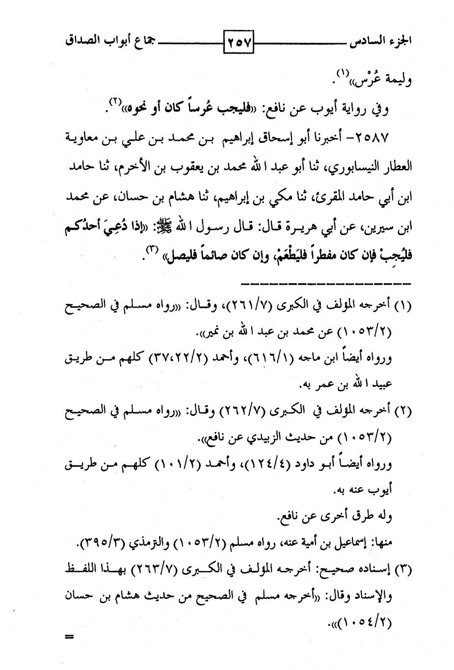 2587 - أخبرنا أبو إسحاق إبراهيم بن محمد بن علي بن معاوية العطار النيسابوري ، ثنا أبو عبد الله محمد بن يعقوب بن الاخرم ، ثنا حامد ابن أبي حامد المقرئ ، ثنا مكي بن ابراهيم ، ثنا هشام بن حسان ، عن محمد ابن سيرين ، عن أبي هريرة قال : قال رسول الله صلى الله عليه وسلم : ' إذا دعي أحدكم فليجب فإن كان مفطرا فليطعم ، وإن كان صائما فليصل ' ( 3 ) .
