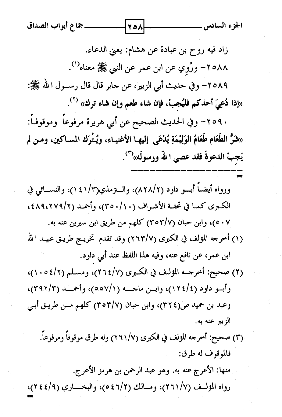 2590 - وفي الحديث الصحيح عن أبي هريرة مرفوعا وموقوفا : ' شر الطعام طعام الوليمة يدعى إليها الاغنياء ، ويترك المساكين ، ومن لم يجب الدعوة فقد عصى الله ورسوله ' ( 3 ) .