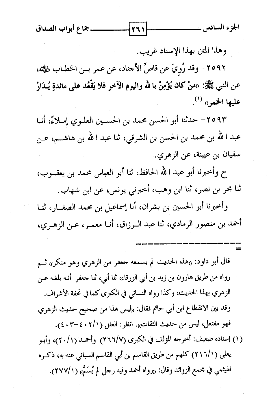 2592 - وقد روي عن قاص الاجناد ، عن عمر بن الخطاب رضي الله عنه ، عن النبي صلى الله عليه وسلم : ' من كان يؤمن بالله واليوم الآخر فلا يقعد على مائدة يدار عليها الخمر ' ( 1 ) .