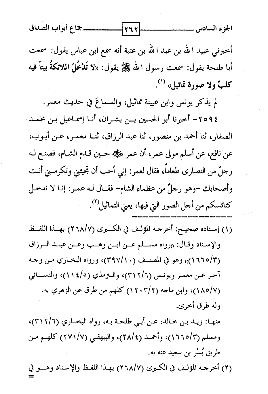 2594 - أخبرنا أبو الحسين بن بشران ، أنا إسماعيل بن محمد الصفار ، ثنا أحمد منصور ، ثنا عبد الرزاق ، ثنا معمر ، عن أيوب ، عن نافع ، عن اسلم مولى عمر ، أن عمر رضي الله عنه حين قدم الشام ، فصنع له رجل من النصارى طعاما ، فقال لعمر : إني احب أن تجيئني وتكرمني أنت وأصحابك - وهو رجل من عظماء الشام - فقال له عمر : إنا لا ندخل كنائسكم من اجل الصور التي فيها ، يعني التماثيل ( 2 ) .