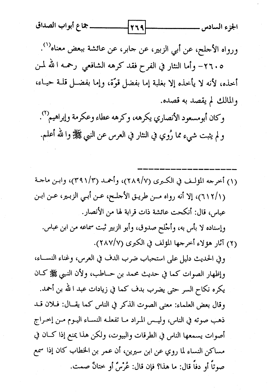 2605 - وأما النثار في الفرح فقد كرهه الشافعي رحمه الله لمن أخذه ، لأنه لا يأخذه إلا بغلبة إما بفضل قوة ، وإما بفضل قلة حياء ، والمالك لم يقصد به قصده . وكان أبو مسعود الأنصاري يكرهه ، وكرهه عطاء وعكرمة وإبراهيم ( 2 ) . ولم يثبت شيء مما روي في النثار في العرس عن النبي صلى الله عليه وسلم والله أعلم .