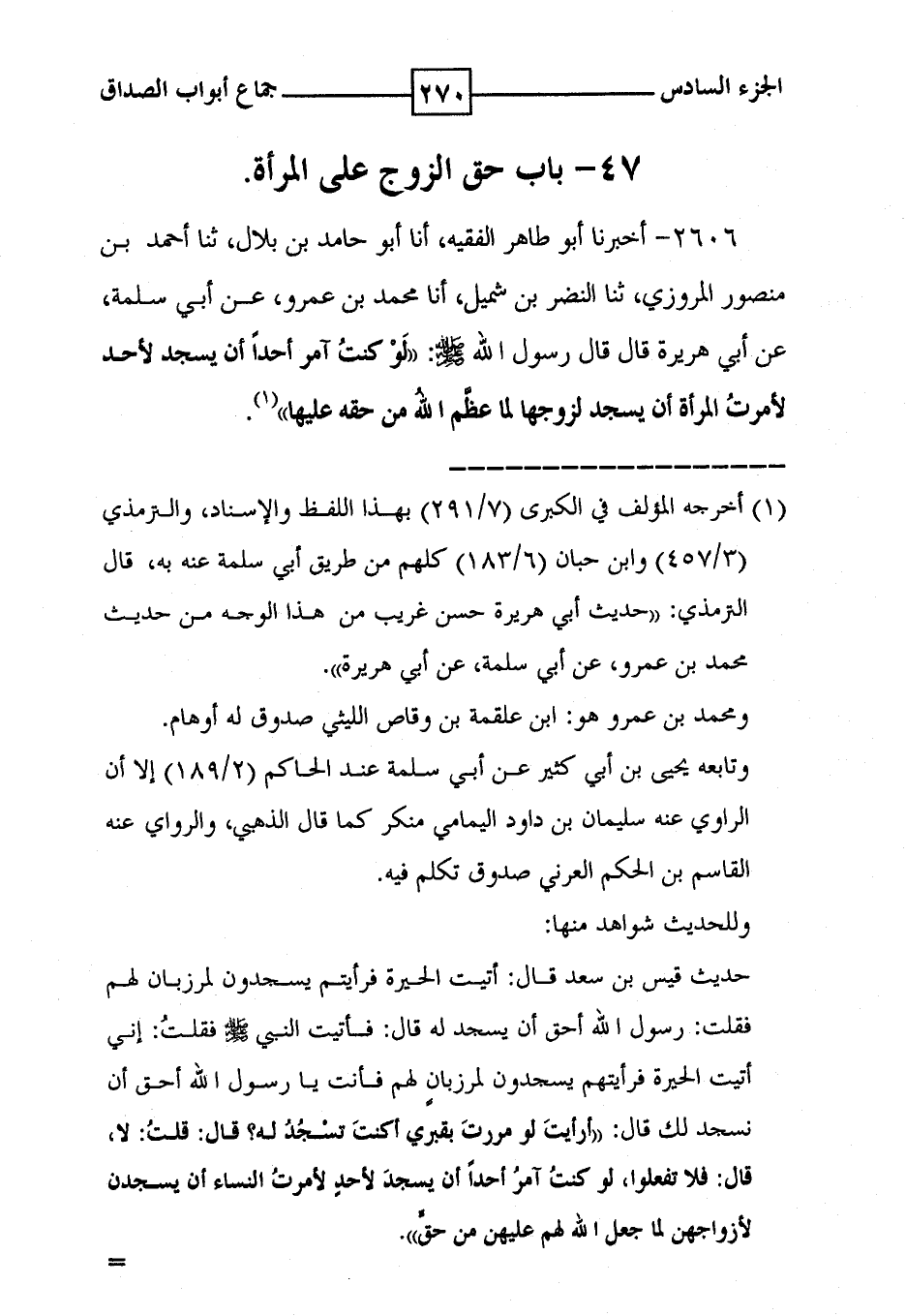 2606 - أخبرنا أبو طاهر الفقيه ، أنا أبو حامد بن بلال ، ثنا أحمد بن منصور المروزي ، ثنا النضر بن شميل ، أنا محمد بن عمرو ، عن أبي سلمة ، عن أبي هريرة قال قال رسول الله صلى الله عليه وسلم : ' لو كنت آمر احدا أن يسجد لأحد لأمرت المرأة أن يسجد لزوجها لما عظم الله من حقه عليها ' ( 1 ) .