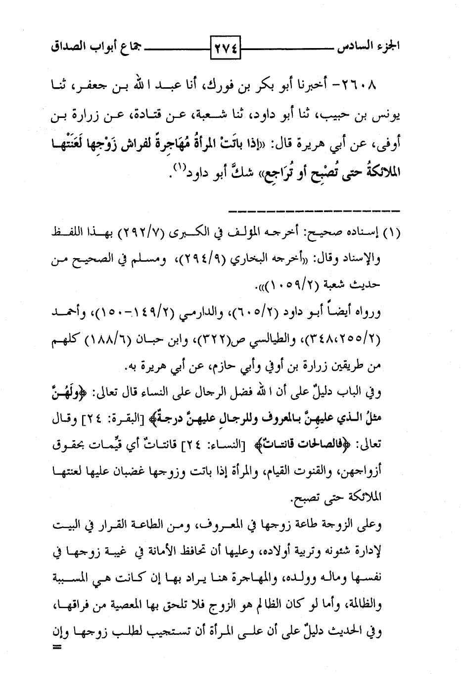 2608 - أخبرنا أبو بكر بن فورك ، أنا عبد الله بن جعفر ، ثنا يونس بن حبيب ، ثنا أبو داود ، ثنا شعبة ، عن قتادة ، عن زرارة بن اوفى ، عن أبي هريرة قال : ' إذا باتت المرأة مهاجرة لفراش زوجها لعنتها الملائكة حتى تصبح أو تراجع ' شك أبو داود ( 1 ) .