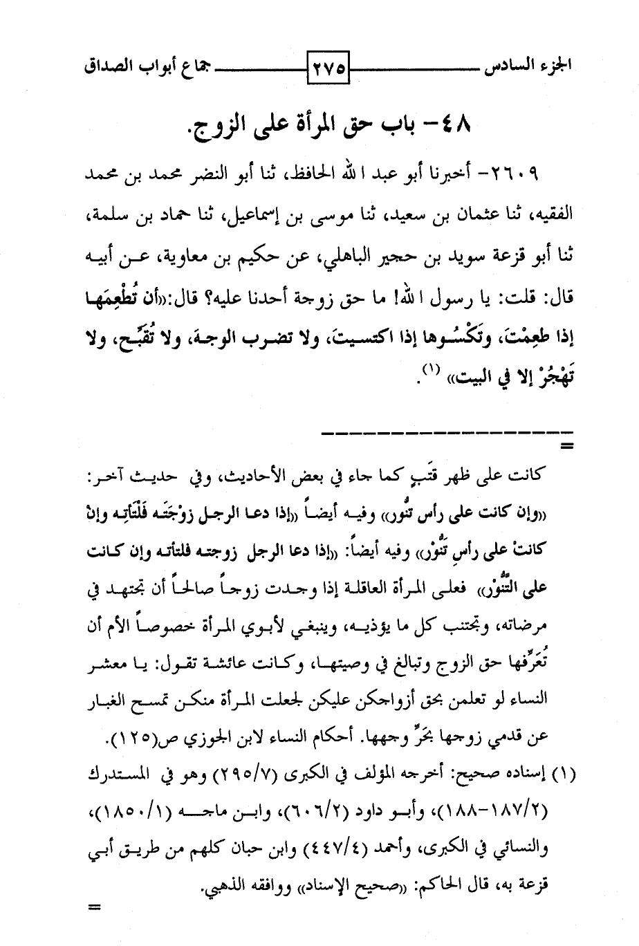 2609 - أخبرنا أبو عبد الله الحافظ ، ثنا أبو النضر محمد بن محمد الفقيه ، ثنا عثمان بن سعيد ، ثنا موسى بن اسماعيل ، ثنا حماد بن سلمة ، ثنا أبو قزعة سويد بن حجير الباهلي ، عن حكيم بن معاوية ، عن أبيه قال : قلت : يا رسول الله صلى الله عليه وسلم ! ما حق زوجة احدنا عليه ؟ قال : ' أن تطعمها إذا طعمت ، وتكسوها إذا اكتسيت ، ولا تضرب الوجه ، ولا تقبح ، ولا تهجر إلا في البيت ' ( 1 ) .