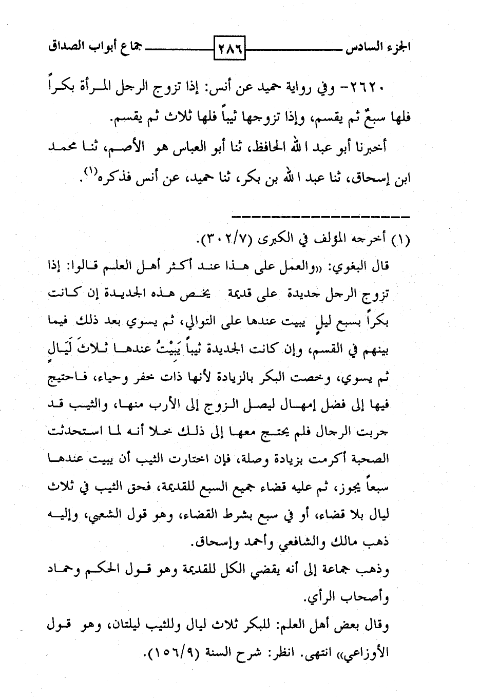 2620 - وفي رواية حميد عن أنس : إذا تزوج الرجل المرأة بكرا فلها سبع ثم يقسمِ ، وإذا تزوجها ثيبا فلها ثلاث ثم يقسم . أخبرنا أبو عبد الله الحافظ ، ثنا أبو العباس هو الاصم ، ثنا محمد ابن اسحاق ، ثنا عبد الله بن بكر ، ثنا حميد ، عن أنس فذكره ( 1 ) .