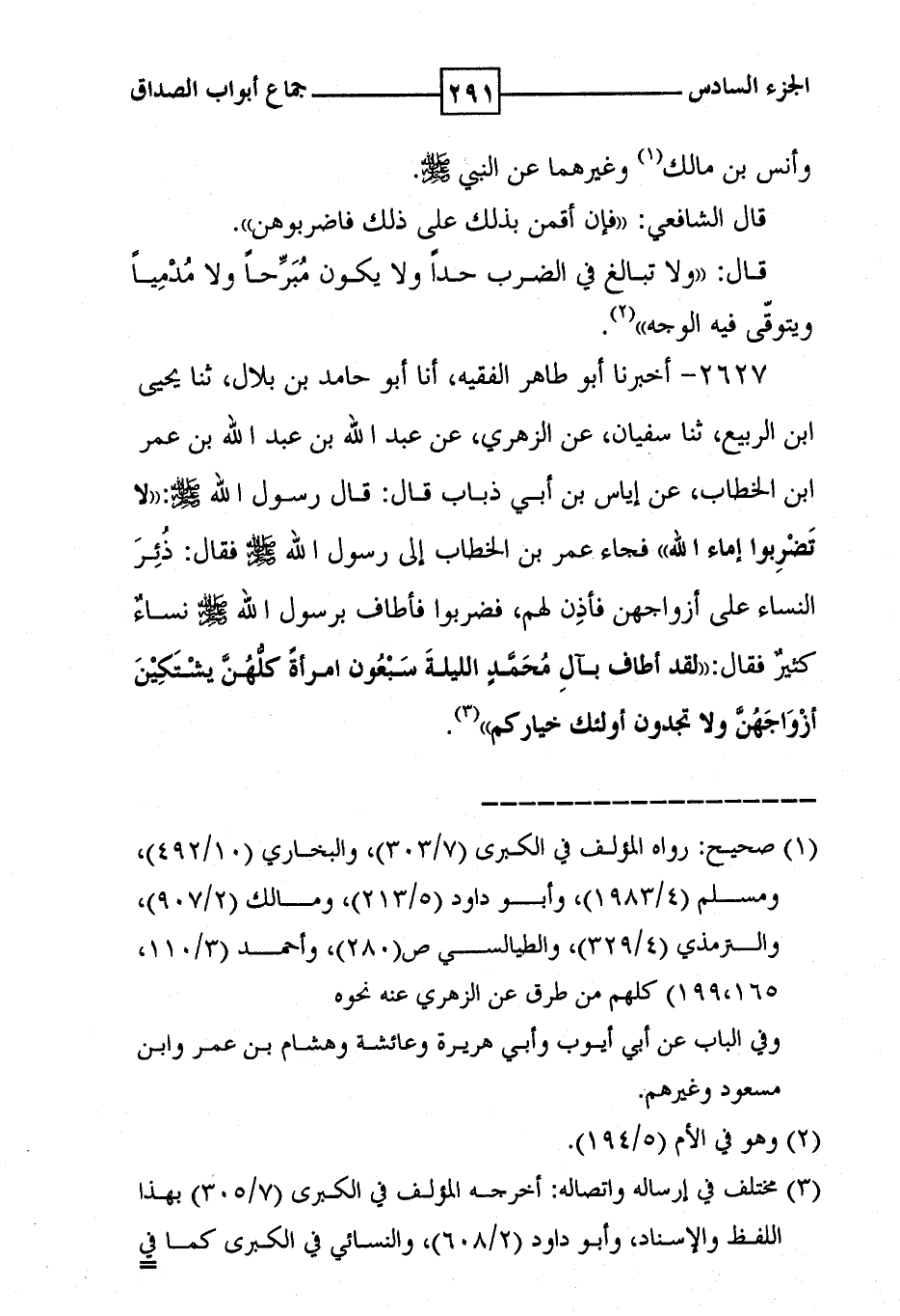 2627 - أخبرنا أبو طاهر الفقيه ، أنا أبو حامد بن بلال ، ثنا يحيى ابن الربيع ، ثنا سفيان ، عن الزهري ، عن عبد الله بن عبد الله بن عمر ابن الخطاب ، عن اياس بن أبي ذباب قال : قال رسول الله صلى الله عليه وسلم : ' لا تضربوا إماء الله ' فجاء عمر بن الخطاب إلى رسول الله صلى الله عليه وسلم فقال : ذئر النساء على ازواجهن فإذن لهم ، فضربوا فأطاف برسول الله صلى الله عليه وسلم نساء كثير فقال : ' لقد اطاف بآل محمد الليلة سبعون امرأة كلهن يشتكين أزواجهن ولا تجدون اولئك خياركم ' ( 3 ) .