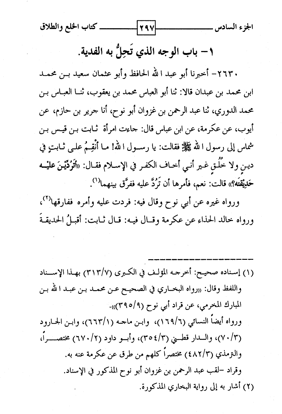 2630 - أخبرنا أبو عبد الله الحافظ وأبو عثمان سعيد بن محمد ابن محمد بن عبدان قالا : ثنا أبو العباس محمد بن يعقوب ، ثنا العباس بن محمد الدوري ، ثنا عبد الرحمن بن غزوان أبو نوح ، أنا جرير بن حازم ، عن أيوب ، عن عكرمة ، عن ابن عباس قال : جاءت امرأة ثابت بن قيس بن شماس إلى رسول الله صلى الله عليه وسلم فقالت : يا رسول الله ! ما انقم على ثابت في دين ولا خلق غير أني اخاف الكفر في الإسلام فقال : ' أتردين عليه حديقته ؟ ' قالت : نعم ، فأمرها أن ترد عليه ففرق بينهما ( 1 ) . ورواه غيره عن أبي نوح وقال فيه : فردت عليه وأمره ففارقها ( 2 ) ، ورواه خالد الحذاء عن عكرمة وقال فيه : قال ثابت : أقبل الحديقة