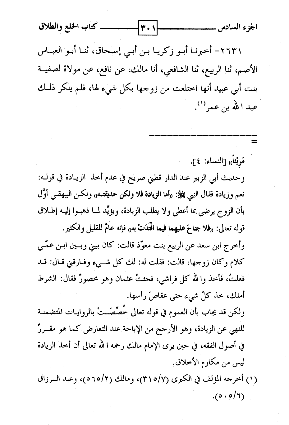 2631 - أخبرنا أبو زكريا بن أبي اسحاق ، ثنا أبو العباس الاصم ، ثنا الربيع ، ثنا الشافعي ، أنا مالك ، عن نافع ، عن مولاة لصفية بنت أبي عبيدة انها اختلعت من زوجها بكل شيء لها ، فلم ينكر ذلك عبد الله بن عمر ( 1 ) .