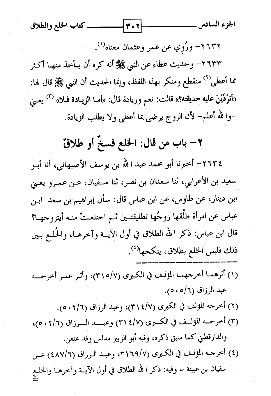 2633 - وحديث عطاء عن النبي صلى الله عليه وسلم انه كره أن يأخذ منها اكثر مما أعطى ( 2 ) منقطع ومنكر بهذا اللفظ ، وإنما الحديث أن النبي صلى الله عليه وسلم قال لها : ' اتردين عليه حديقته ؟ ' قالت : نعم وزيادة قال : ' أما الزيادة فلا ' ( 3 ) يعني - والله اعلم - لأن الزوج يرضى بما أعطى ولا يطلب الزيادة . 2 - باب من قال : الخلع فسخ أو طلاق