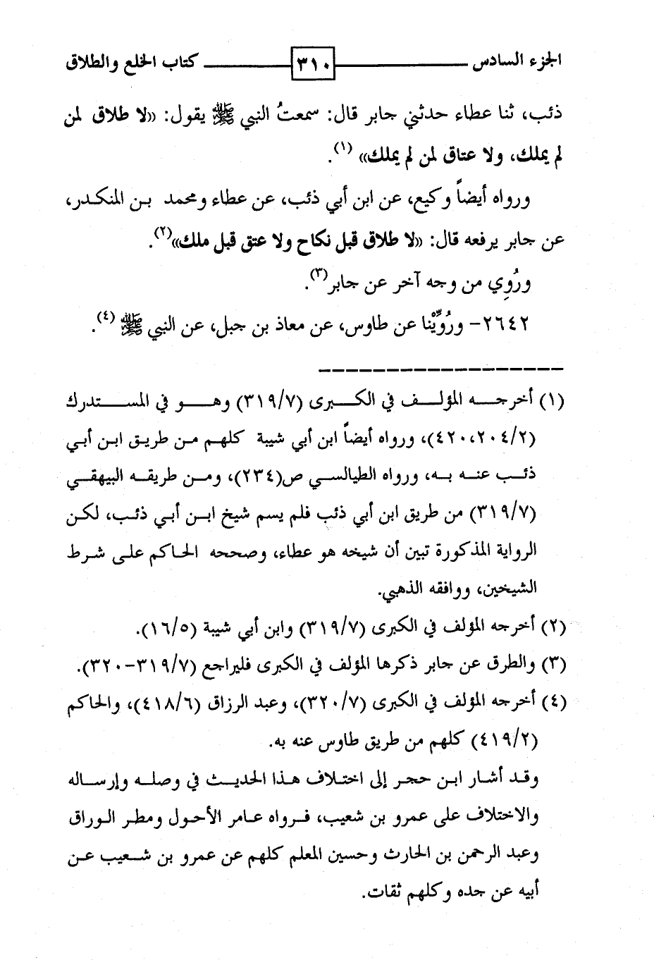 ذئب ، ثنا عطاء حدثني جابر قال : سمعت النبي صلى الله عليه وسلم يقول : ' لا طلقا لمن لم يملك ، ولا عتاق لمن لم يملك ' ( 1 ) . ورواه أيضا وكيع ، عن ابن أبي ذئب ، عن عطاء ومحمد بن المنكدر ، عن جابر يرفعه قال : ' لا طلاق قبل نكاح ولا عتق قبل ملك ' ( 2 ) . وروي من وجه آخر عن جابر ( 3 ) .