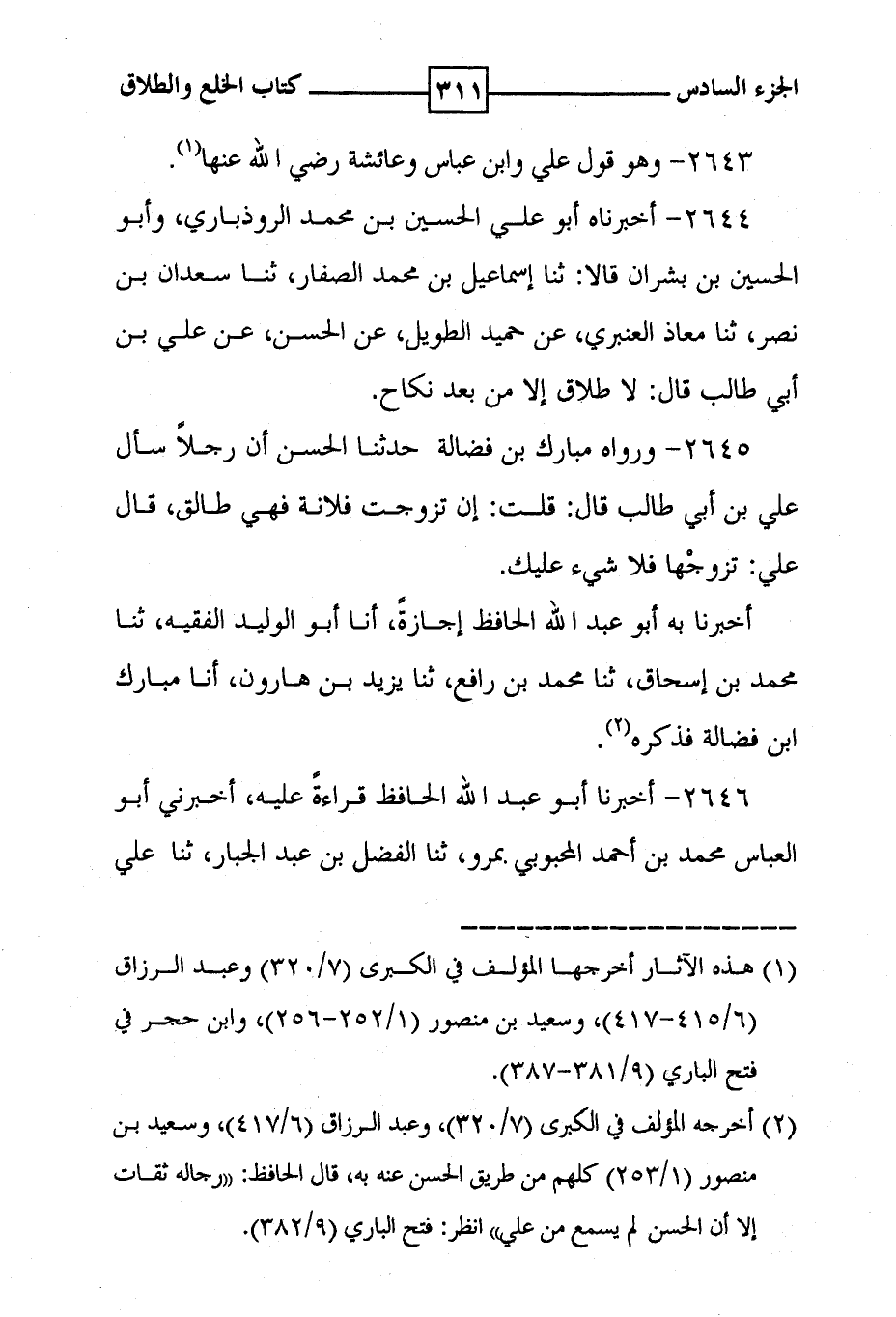 2644 - أخبرناه أبو علي الحسين بن محمد الروذباري ، وأبو الحسين بن بشران قالا : ثنا إسماعيل بن محمد الصفار ، ثنا سعدان بن نصر ، ثنا معاذ العنبري ، عن حميد الطويل ، عن الحسن ، عن علي بن أبي طالب قال : لا طلاق إلا من بعد نكاح .