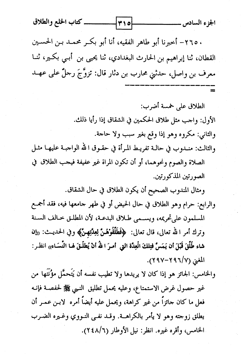 2650 - أخبرنا أبو طاهر الفقيه ، أنا أبو بكر محمد بن الحسين القطان ، ثنا إبراهيم بن الحارث البغدادي ، ثنا يحيى بن أبي بكير ، ثنا معرف بن واصل ، حدثني محارب بن دثار قال : تزوج رجل على عهد