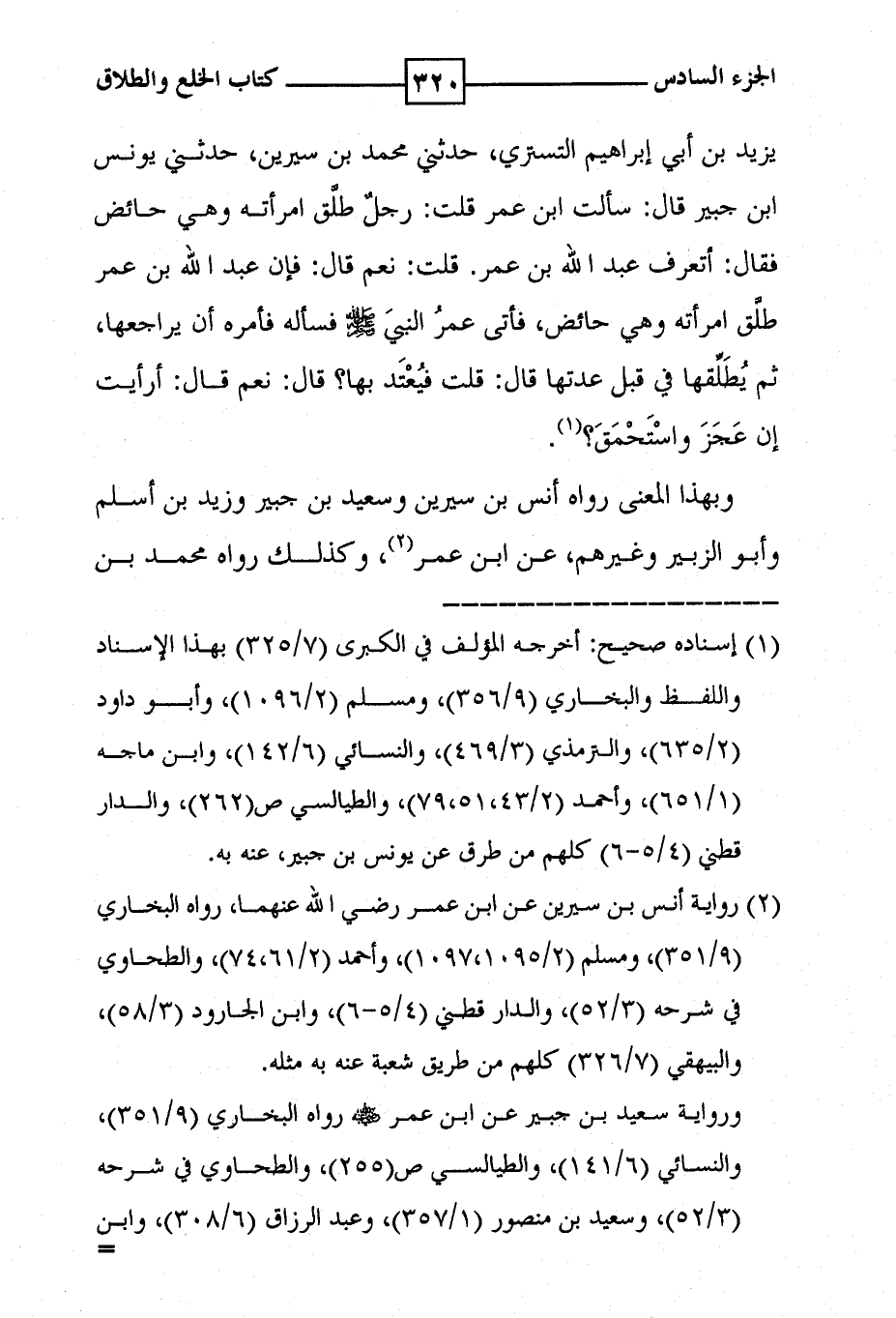 يزيد بن أبي إبراهيم التستري ، حدثني محمد بن سيرين ، حدثني يونس ابن جبير قال : سألت ابن عمر قلت : رجل طلق امرأته وهي حائض فقال : اتعرف عبد الله بن عمر . قلت : نعم قال : فإن عبد الله بن عمر طلق امرأته وهي حائض ، فأتى عمر النبي صلى الله عليه وسلم فسأله فأمره أن يراجعها ، ثم يطلقها في قبل عدتها قال : قلت فيعتد بها ؟ قال : نعم قال : ارأيت إن عجز واستحمق ؟ ( 1 ) . وبهذا المعنى رواه أنس بن سيرين وسعيد بن جبير وزيد بن اسلم وأبو الزبير وغيرهم ، عن ابن عمر ( 2 ) ، وكذلك رواه محمد بن