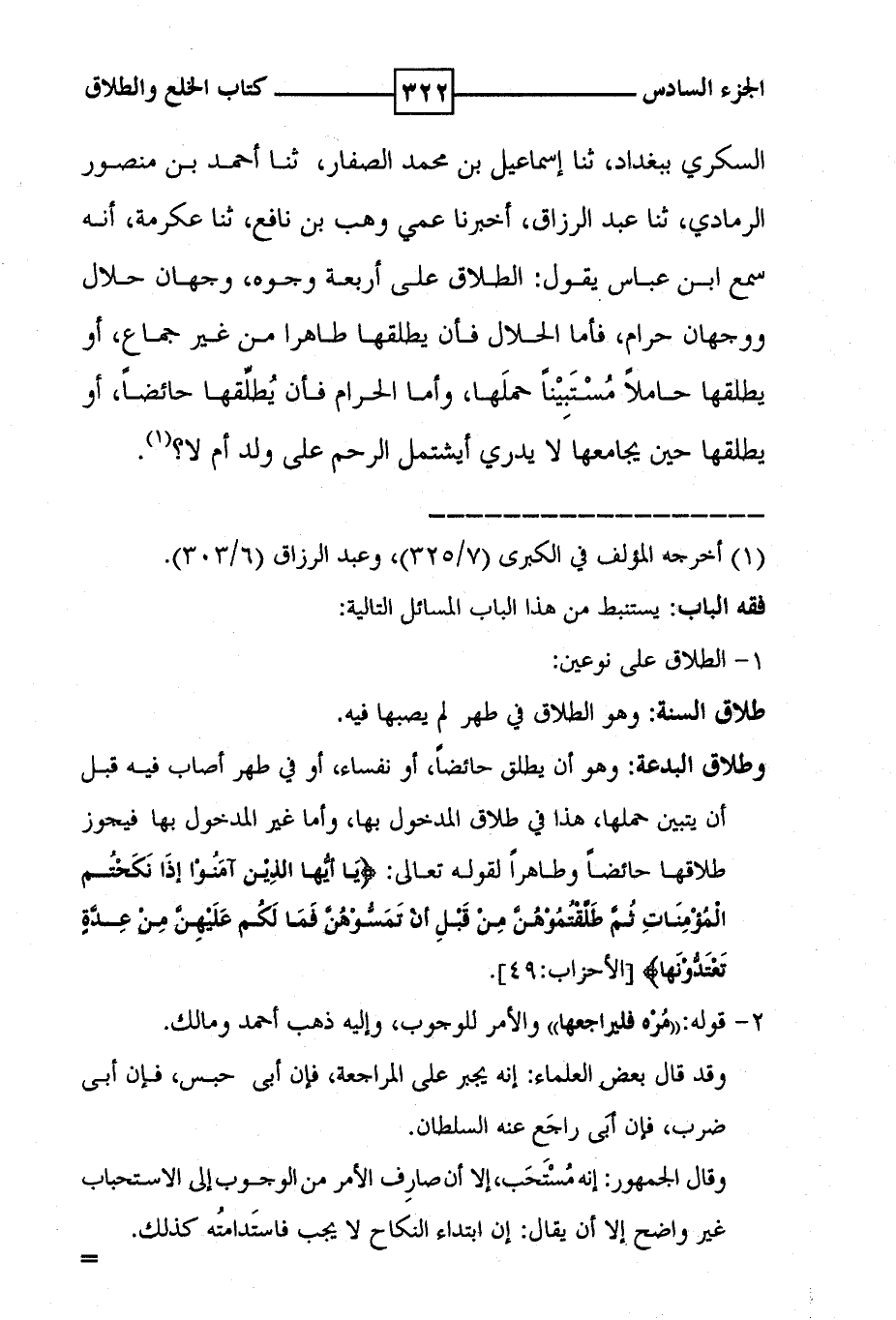 السكري ببغداد ، ثنا إسماعيل بن محمد الصفار ، ثنا أحمد بن منصور الرمادي ، ثنا عبد الرزاق ، أخبرنا عمي وهب بن نافع ، ثنا عكرمة ، انه سمع ابن عباس يقول : الطلاق على أربعة وجوه ، وجهان حلال ووجهان حرام ، فأما الحلا فأن يطلقها طاهرا من غير جماع ، أو يطلقها حاملا مستبينا حملها ، واما الحرام فأن يطلقها حائضا ، أو يطلقها حين يجامعها لا يدري ايشتمل الرحم على ولد أم لا ؟ ( 1 ) .