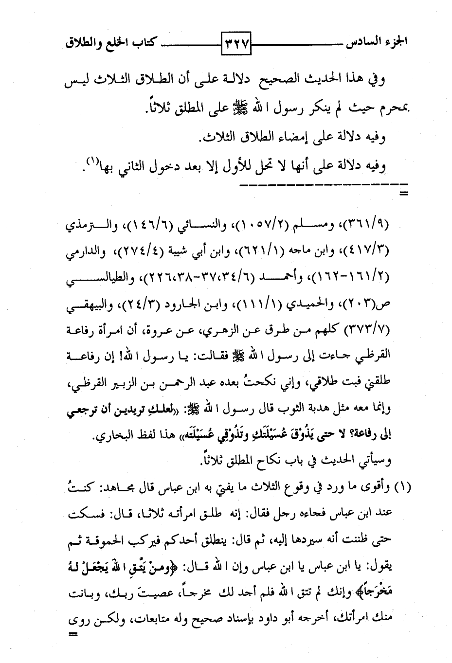 وفي هذا الحديث الصحيح دلالة على أن الطلاق الثلاث ليس بمحرم حيث لم ينكر رسول الله صلى الله عليه وسلم على المطلق ثلاثا . وفيه دلالة على إمضاء الطلاق الثلاث . وفي دلالة على انها لا تحل للاول إلا بعد دخول الثاني بها ( 1 ) .